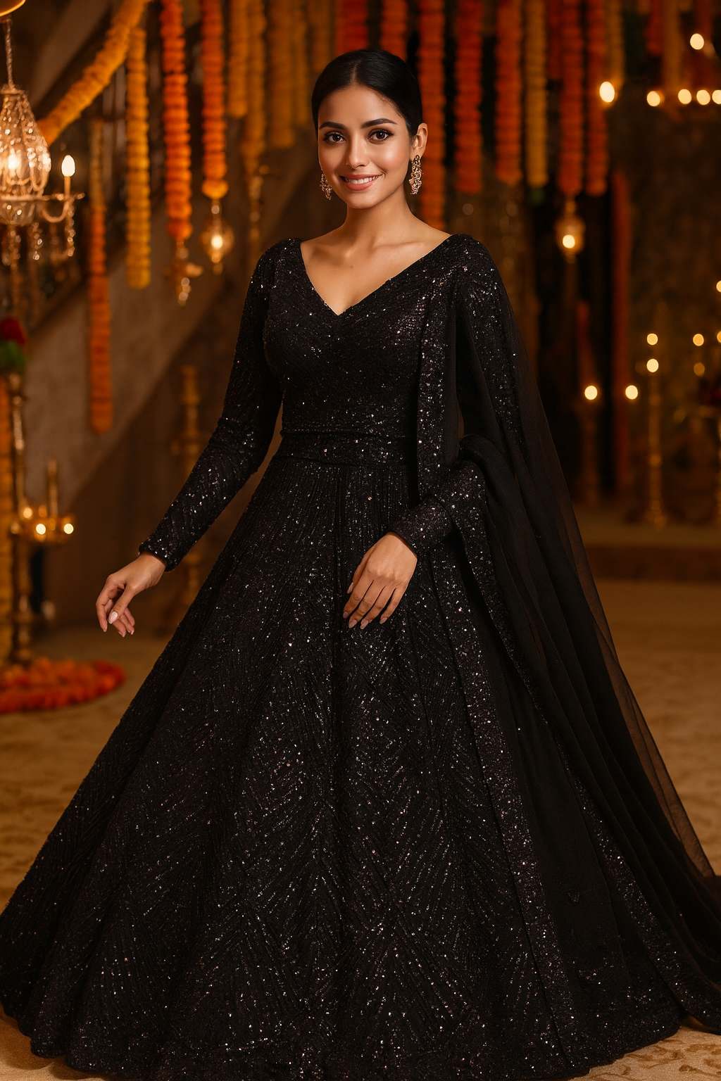 This outfit is a black sequined Anarkali-style gown, perfect for evening and festive occasions. Here’s a clear breakdown: