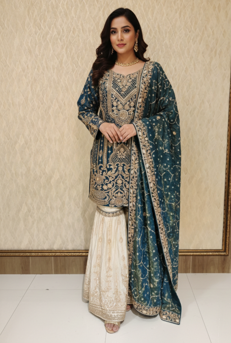 Heavy embroidered teal kurti paired with graceful sharara and a beautifully detailed dupatta β perfect for weddings, festive functions & special occasions.