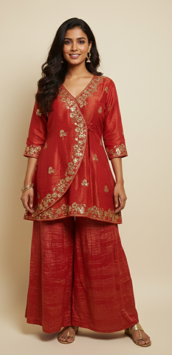 Elevate your festive wardrobe with this stunning Angrakha-style tunic and flared sharara set. Crafted in a rich metallic red hue and adorned with intricate gold floral embroidery, this ensemble perfectly blends traditional silhouette with contemporary flair.